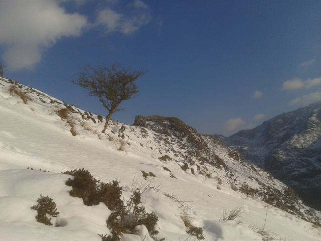 From here, I decided to head up the southern slopes of the Western Glyder range to Y Garn. Looking at the map, it was clear this was merely a 'gentle' slope to the top, as opposed to a steeper, and craggier affair on the other side, which may be less appreciated in the snow. We barely got far before the task at hand became apparent. I was kicking steps for us to walk on, and was going into the snow about knee deep consistently. I was up to my waist on several occasions, and Julia was wise to ignore those routes I was cutting. Needless to say, someone wasn't having as much fun as I clearly was.